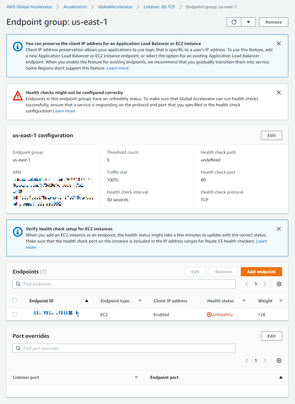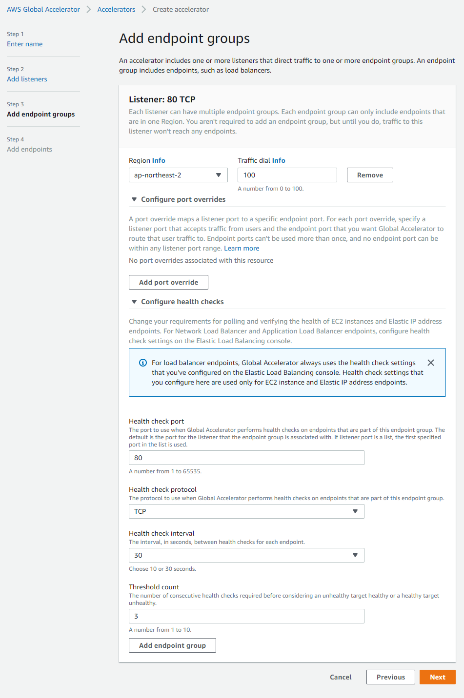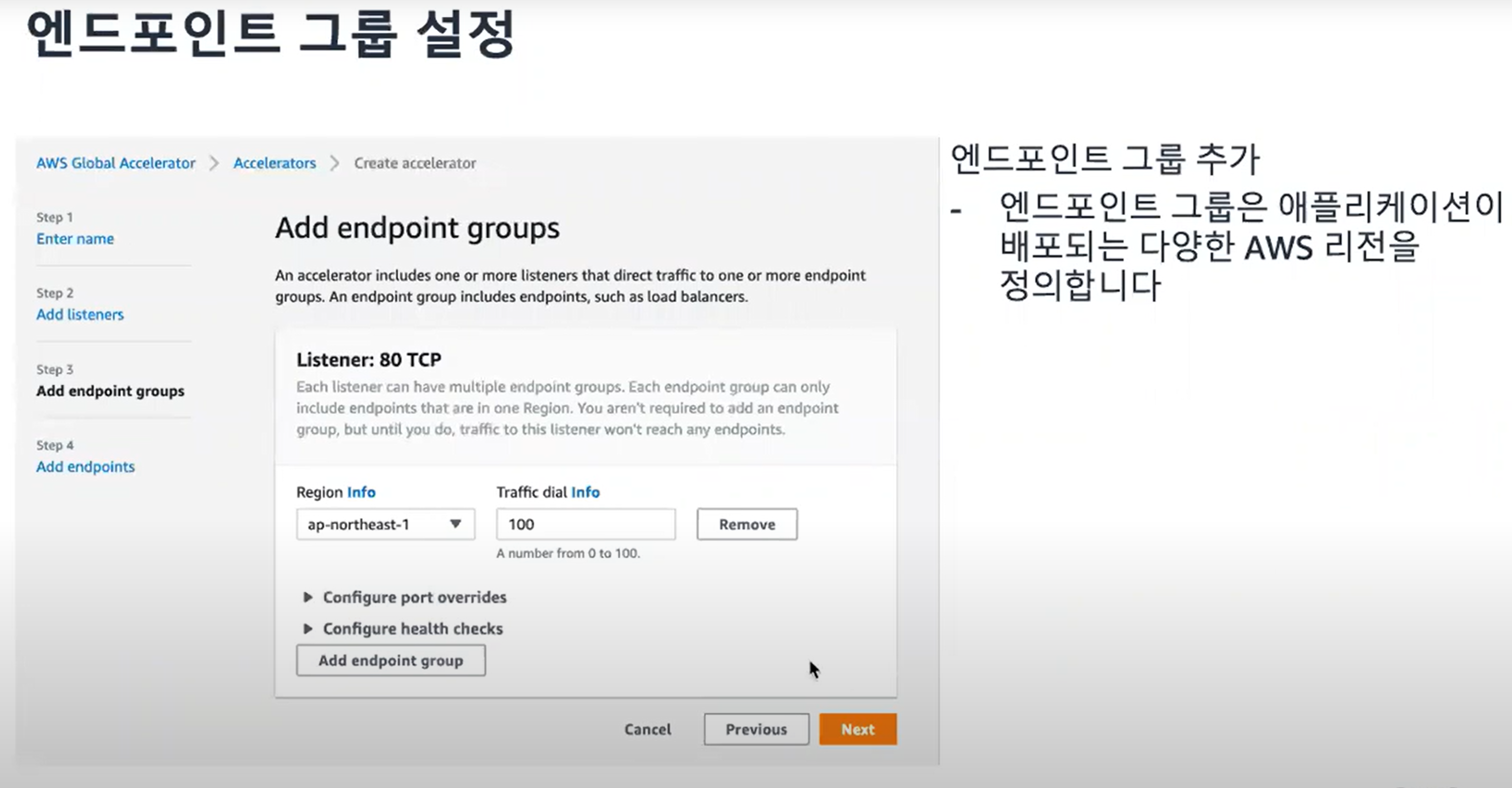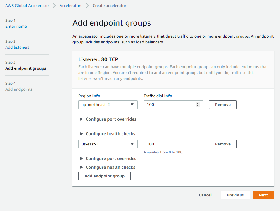 추가로 버지니아 Region에도 EC2를 만들었기 때문에 Endpoint Group을 추가하여 us-east-1을 선택하고 Next를 클릭하여 넘어간다.