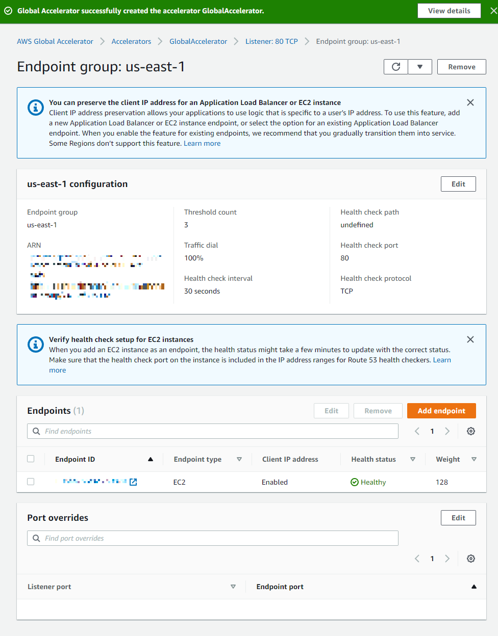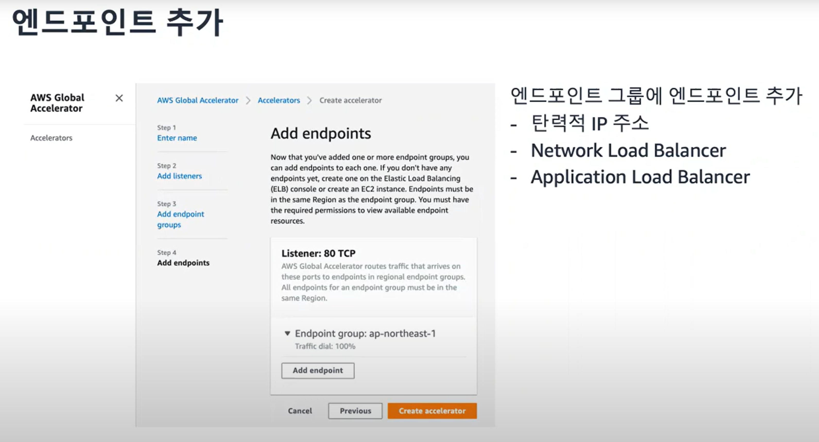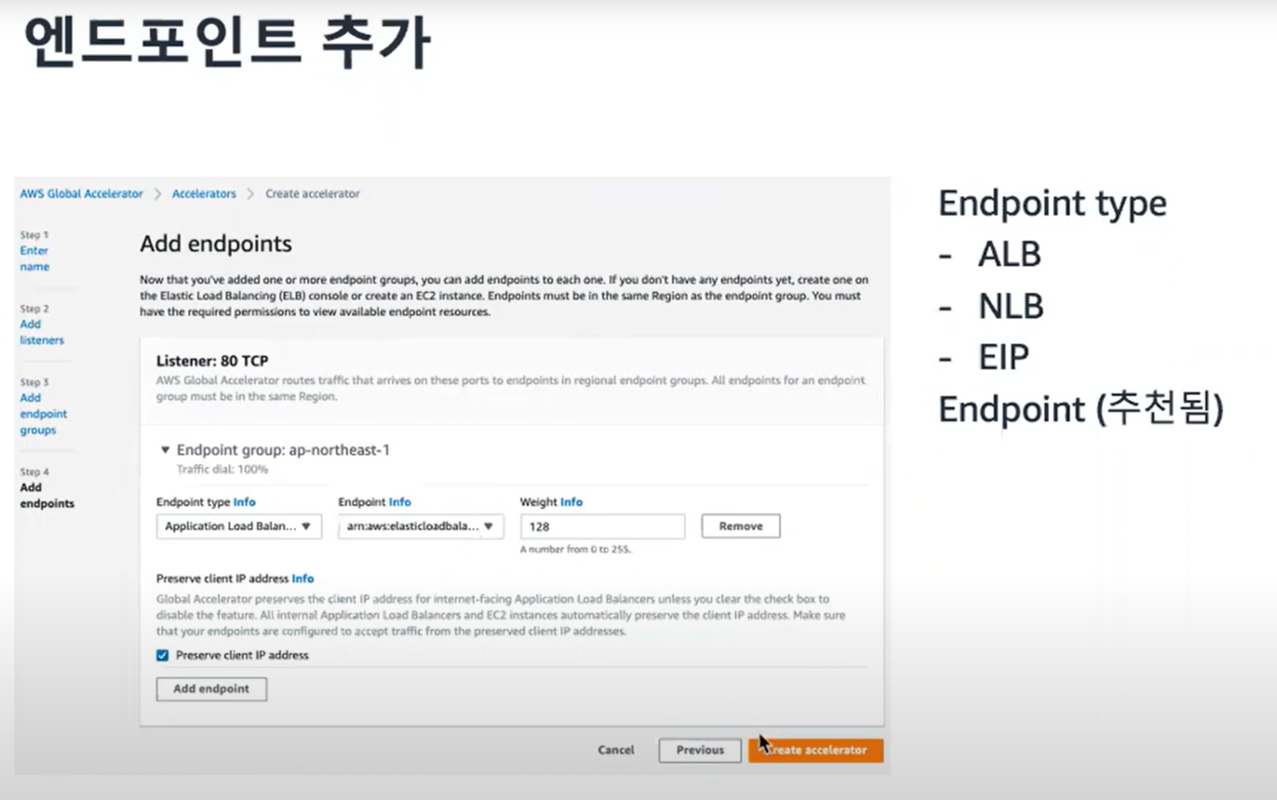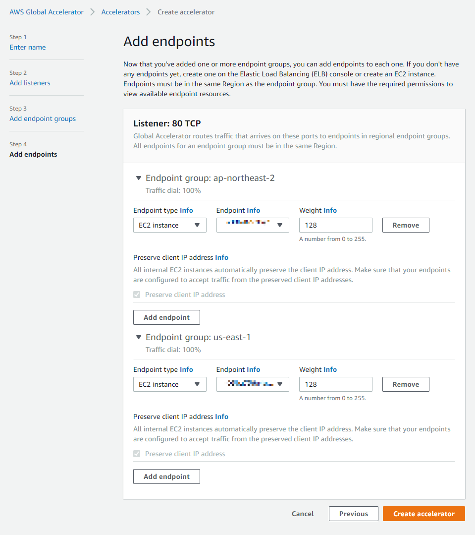 다음으로 버지니아 북부의 Endpoint도 설정을 하고 Create accelerator를 클릭하여 생성한다.