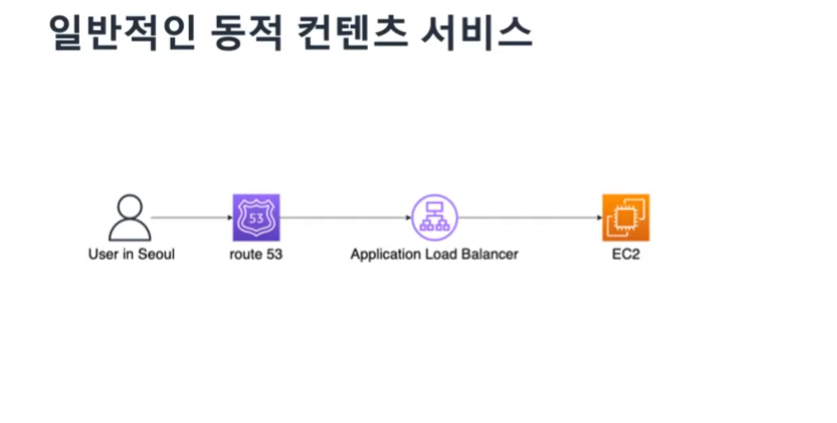 보통은 일반적으로 동적 컨텐츠를 서비스한다고 했을때, 위와 같이 Route53을 통해서 EdgeLocation의 DNS로 접속하고 Application Load Balancer를 통해서 웹서비스를 하고 있는 EC2로 접속하여 서비스를 확인한다.