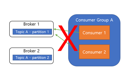 무조건, Consumer Group내의 Consumer들은 모두 각기 다른 Partition에 연결되어야 한다. 이렇게 함으로서 Consumer의 메시지 처리 순서를 보장하게 된다. 즉, 위와 같은 그림의 형태로는 가능하지만,