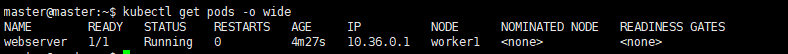 현재 webserver 라는 이름의 pod가 실행되고 있고 worker node1에서 파드가 실행되는 것을 확인할 수 있다.