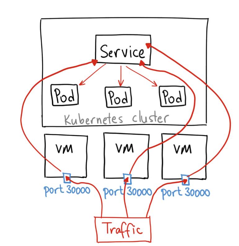 여기서 NodePort라는 파라미터는 외부에서 노드 IP의 특정 포트로 들어오는 요청을 감지하여 해당 포트와 연결된 파드로 트래픽을 전달하는 유형의 서비스이다.