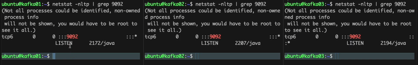 : 각 서버에서 9092 포트를 리스닝 중이라면 정상 실행 중인 것이다.