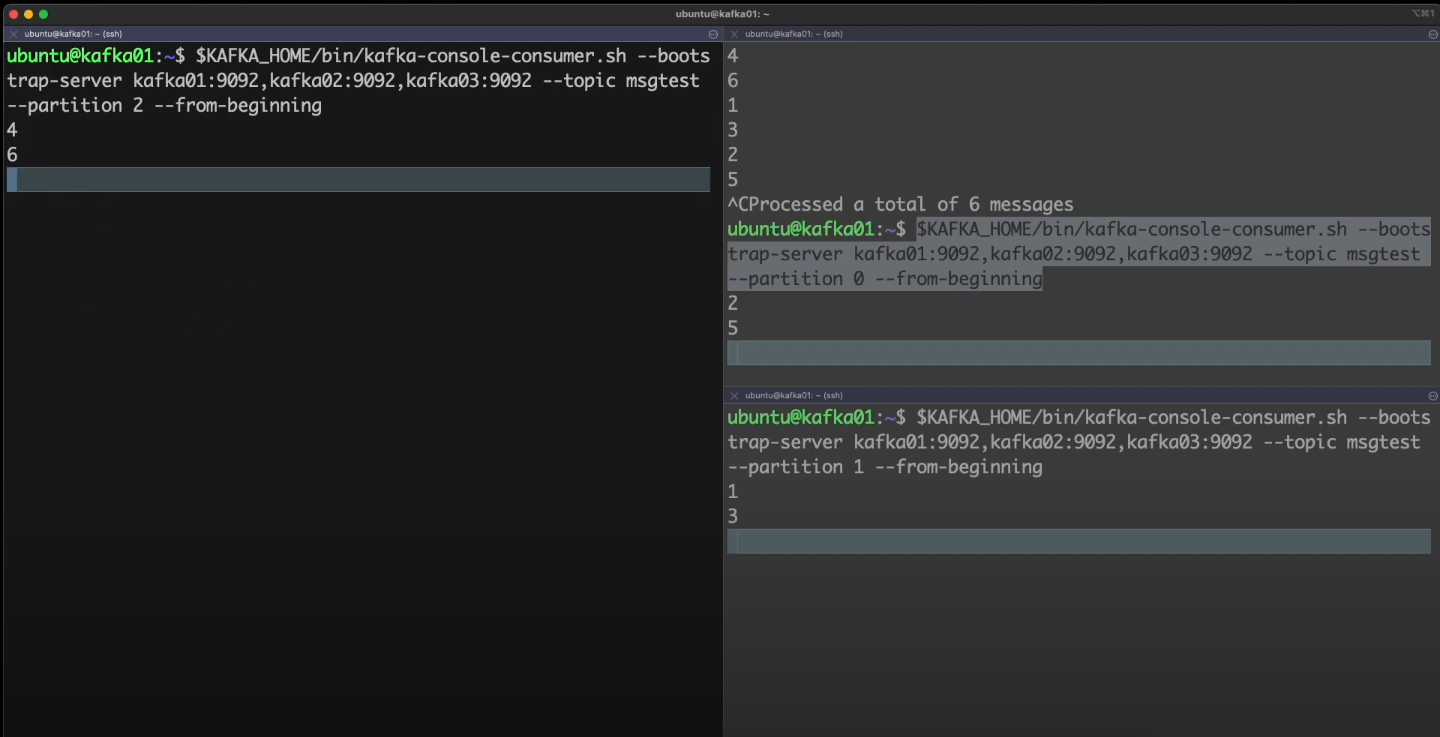 : topic(partition-test)을 3개의 파티션에 나눠 저장하였는데, 그 중 세 번째 파티션에 저장된 데이터를 확인할 수 있다.