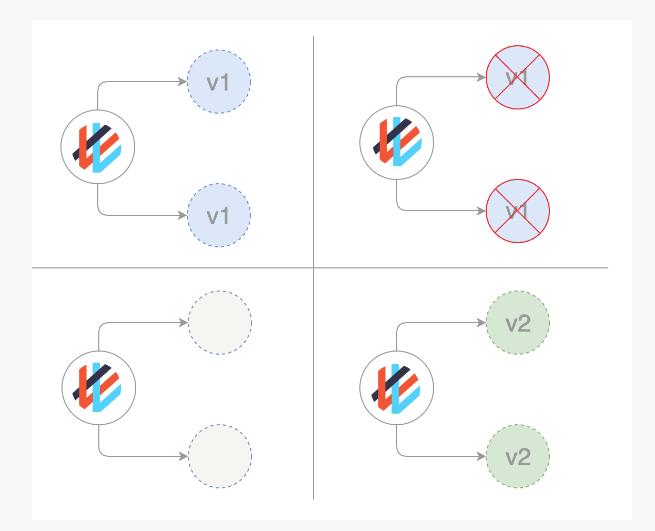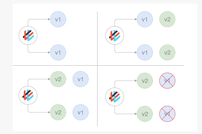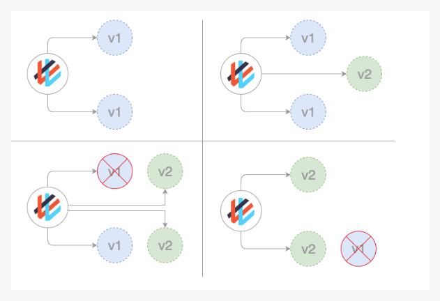아래 그림을 살펴보면 먼저 v1 두개를 삭제 한 후 빈 공간에 v2를 채워 넣는 식으로 모든 pod가 종료되기 때문에 DownTime이 발생한다.