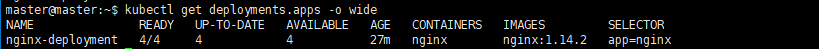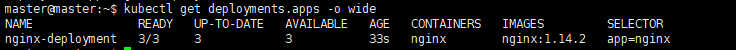 현재 우리가 name으로 지정해 두었던 nginx-deployment가 생성 된 것을 확인할 수 있고 총 3개가 띄워져 3개 모두 사용 가능한 것을 알 수 있다. Selector 역시 위에서 설정했던 app:nginx 임을 확인할 수 있다.