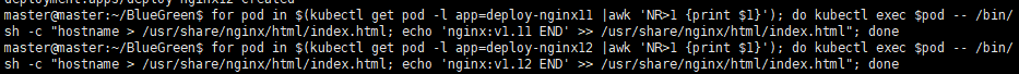 for pod in $(kubectl get pod -l app=deploy-nginx12 |awk 'NR>1 {print $1}'); do kubectl exec $pod -- /bin/sh -c "hostname > /usr/share/nginx/html/index.html; echo 'nginx:v1.12 END' >> /usr/share/nginx/html/index.html"; done