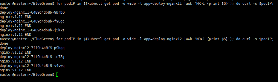 for podIP in $(kubectl get pod -o wide -l app=deploy-nginx12 |awk 'NR>1 {print $6}'); do curl -s $podIP; done