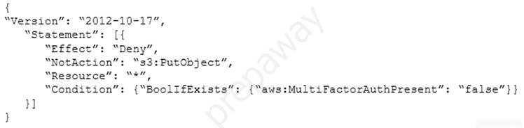 - A. Users will be allowed all actions except s3:PutObject if multi-factor authentication (MFA) is enabled.