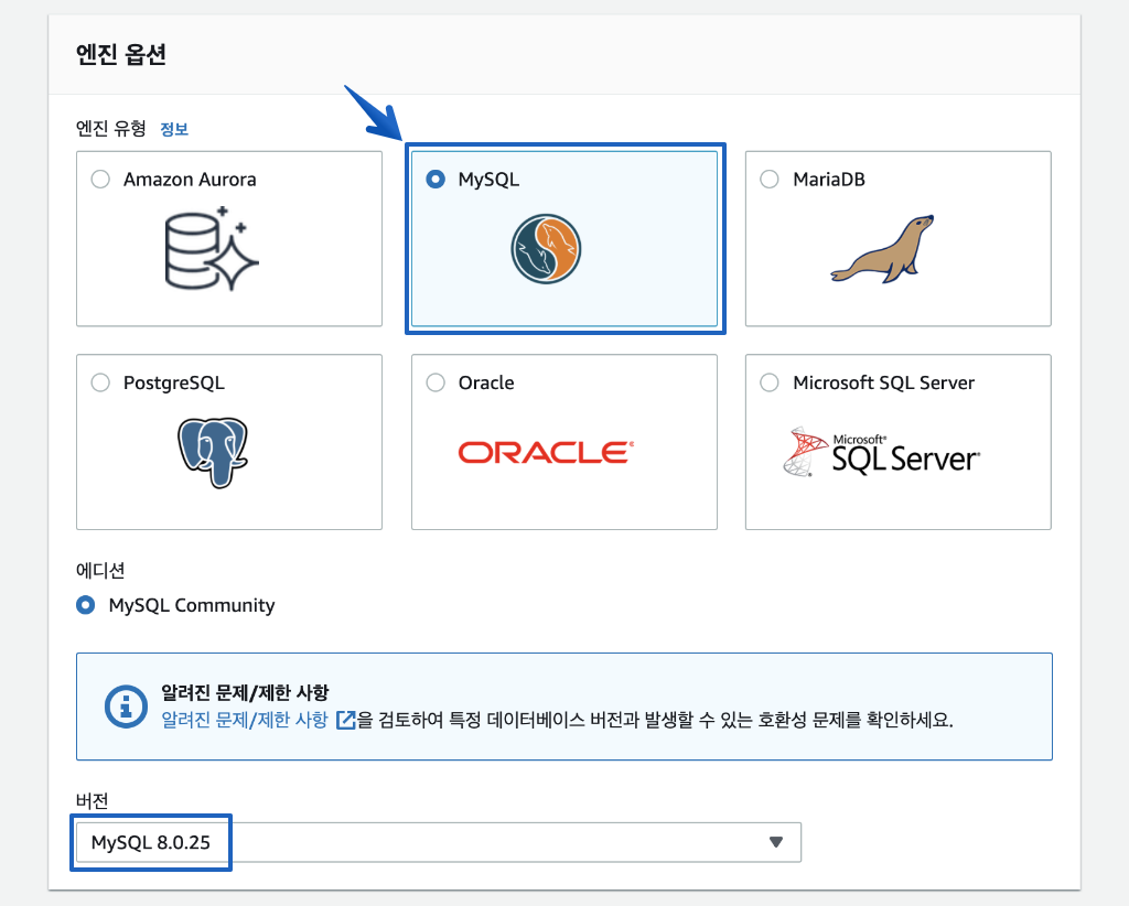 생성 메뉴에서 먼저 버전을 선택을 해야 하며 lower_case_table_names=1 를 사용하기 위해서 8.0.19 버전 이상으로 선택하면 됩니다.