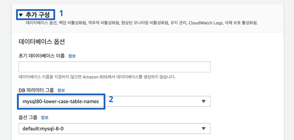 그래서 Amazon RDS for MySQL 8.0 에서도 lower_case_table_names =1 을 사용 하기 위해서는 이렇게 먼저 파라미터 그룹을 생성 및 파라미터를 수정하여 인스턴스를 생성 하시면 됩니다