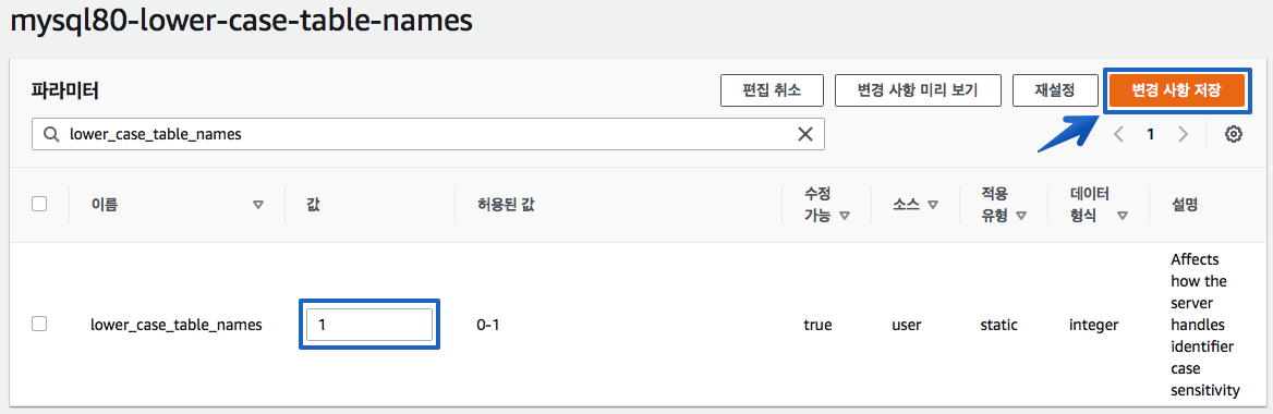 파라미터 검색 항목에서lower_case_table_names를 입력하여 검색 후에 "파라미터 편집" 을 클릭 합니다.