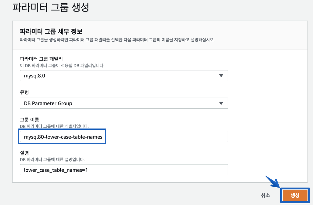 파라미터 그룹을 생성 항목에서 파라미터 그룹 패밀리는 "mysql8.0" 으로 선택 하고 그룹 이름은 자유롭게 입력 후 하단의 "생성" 버튼을 클릭 합니다.