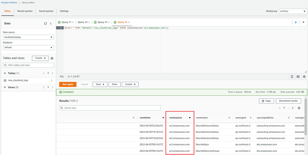 이제 테이블 안에 있는 필요한 데이터만 불러와 확인하면 된다. default 데이터베이스에 new_cloudtrail_logs라는 테이블에서 eventsource가 ec2.amazonaws.com과 일치한 데이터를 모두 불러와 보았다.