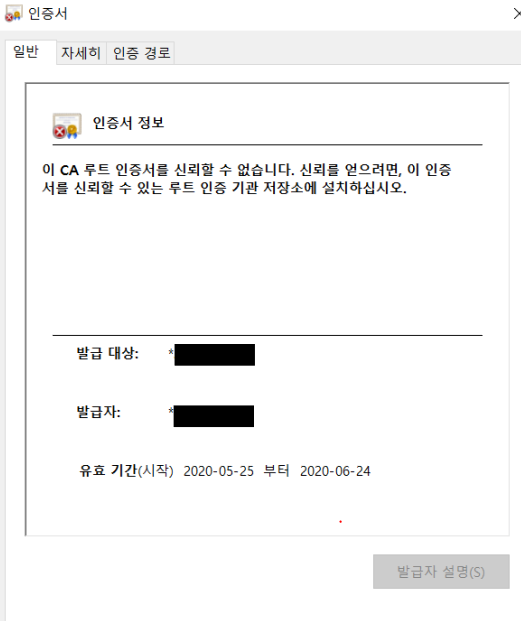 인증서오류 : 현재 적용한 인증서를 웹브라우저가 가지고 있지 않아서 발생
