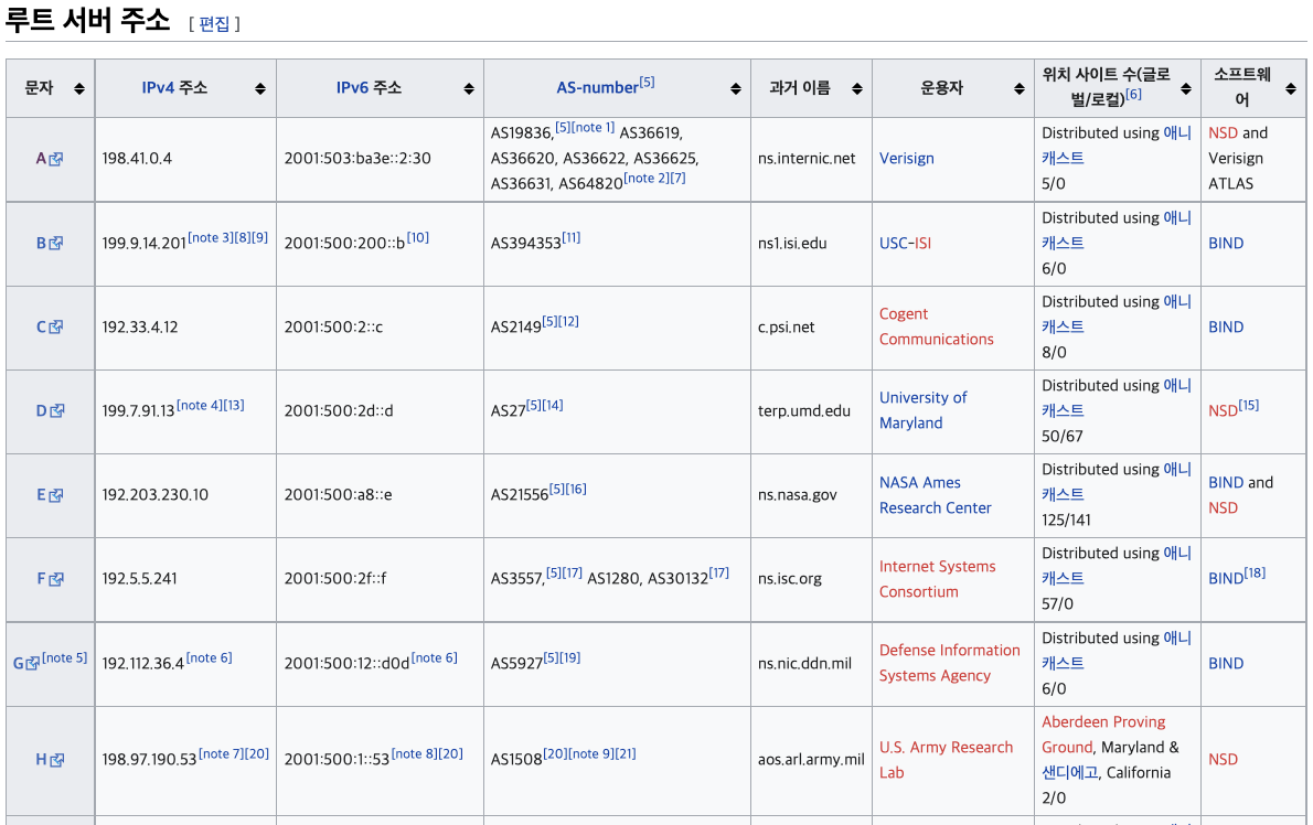 전세계 루트 서버 리스트의 일부