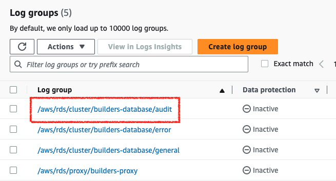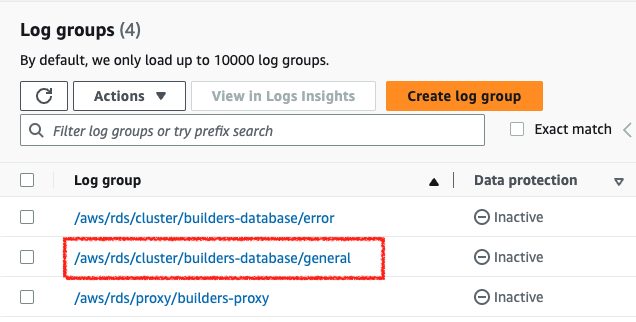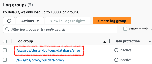 Error 로그는 기본적으로 활성화되며 RDS 생성시에 Log export를 체크했기 때문에 CloudWatch Logs에서 바로 확인이 가능합니다. log