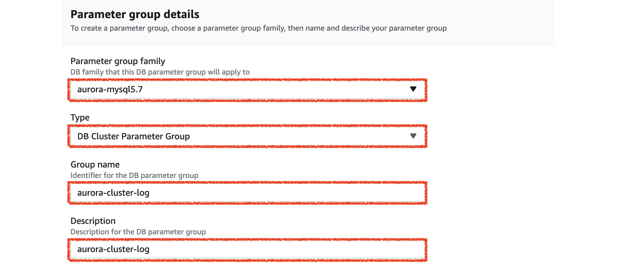 - Parameter group details를 아래와 같이 설정합니다. DB Cluster Parameter Group의 파라미터는 클러스터의 모든 인스턴스에 적용됩니다.
