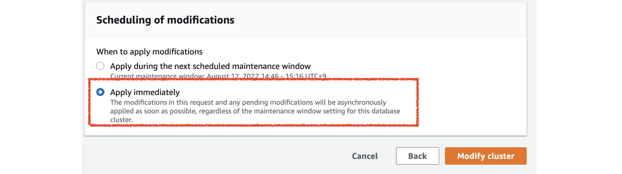 - [Continue] 를 클릭하고, 변경 사항이 즉시 적용될 수 있도록 Apply immediately 선택한 뒤 [Modify cluster] 를 클릭합니다.
