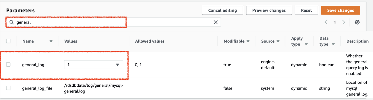 - Parameter groups 목록에서 aurora-cluster-log를 선택하고 [Parameter group actions] 클릭한 뒤 [Edit] 을 선택합니다. 검색창에 general_log를 검색하고 Values를 1로 변경해주세요. [Save changes] 를 눌러 변경사항 저장합니다.
