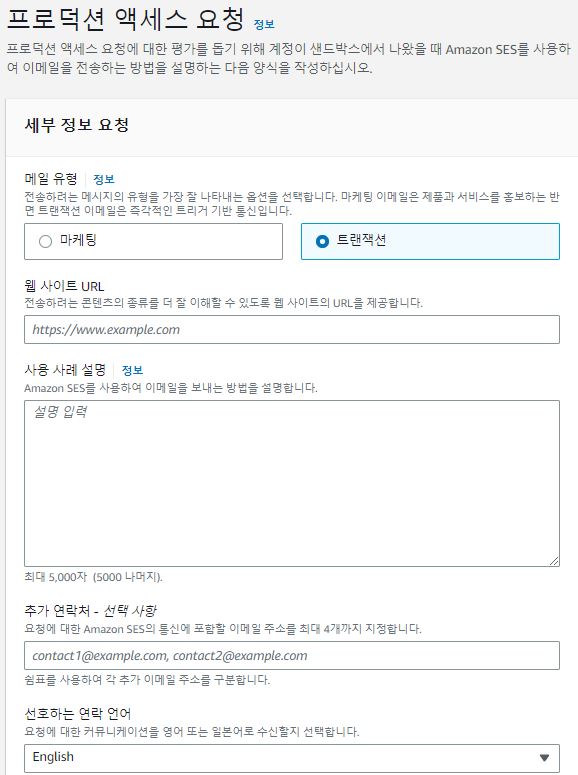 웹 서비스를 운영하는 사이트에서는 일일 발송량이 몇백 건, 몇천 건 그 이상이 발송될 수 있고 사용자 이메일 주소는 AWS SES 자격증명이 되지 않았으니 샌드박스 환경에서는 적용할 수 없습니다. 샌드박스 환경에 나가기 위해서는 프로덕션 액세스 요청을 하면 됩니다.