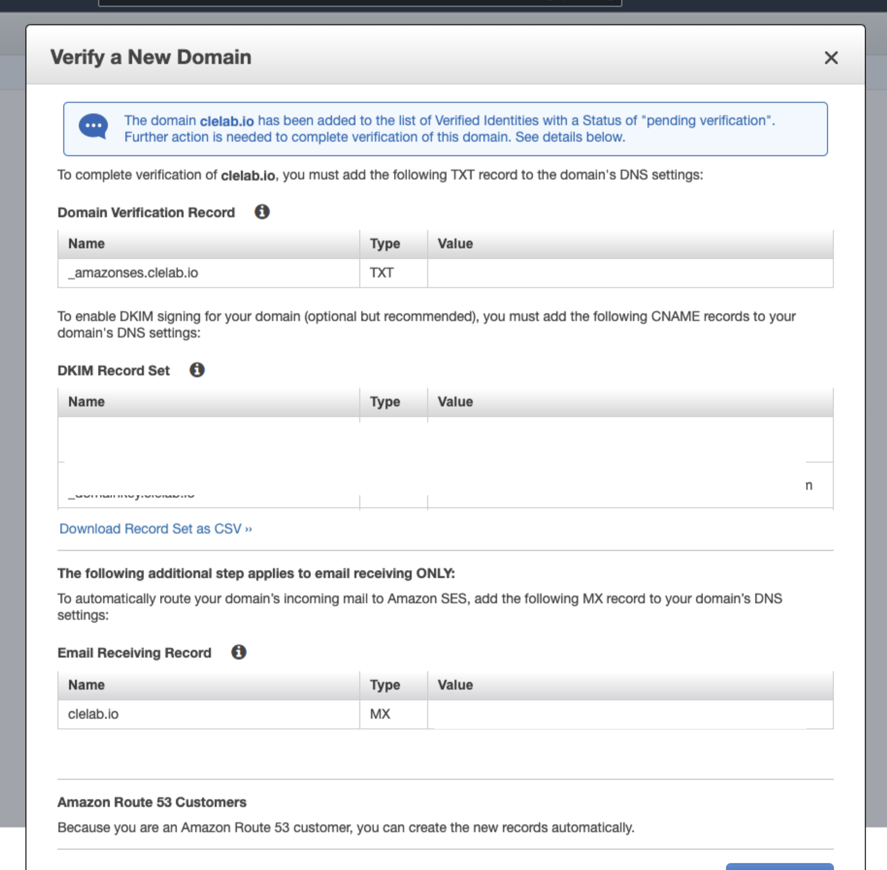 도메인 생성이 되었습니다! Route53에 가면 해당 이름으로 도메인들이 생성된 것을 확인할 수 있습니다. 그 이후에 Route53에서 새로고침을 눌러주고 도메인 주소 목록에서 새로고침을 눌러주면