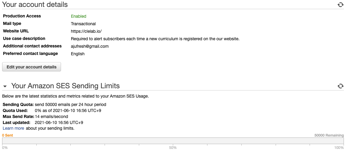 상태가 'Sandbox'에서 'Enabled'로 바뀐 것을 확인할 수 있습니다! 저는 제한을 늘렸기 때문에 하루에 50000건까지 발송이 가능하게 되었습니다.