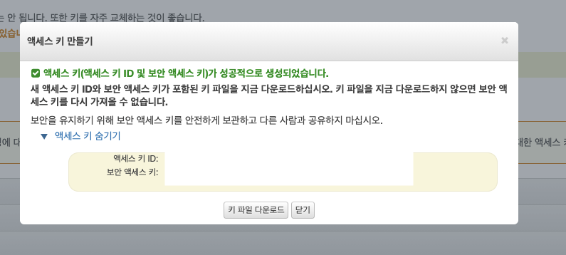 액세스키가 생성된 이후에 토글을 클릭하면 액세스 키 ID와 보안 액세스 키를 확인할 수 있습니다. 이를 잘 적어두거나 키 파일을 다운로드해서 액세스 키와 보안 액세스 키의 정보를 저장해둡니다. 이 때, 액세스 키와 보안 액세스 키는 절대로 외부에 유출되지 않게 주의해야합니다.