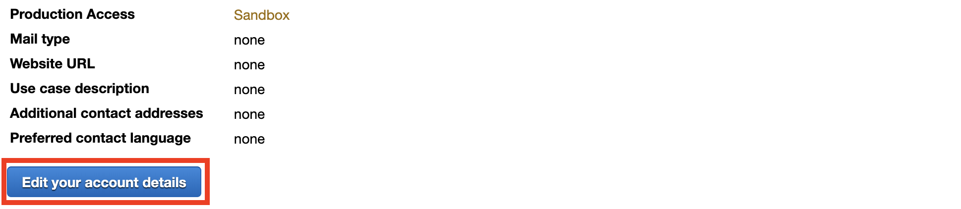 Sandbox상태를 해제하기 위해서는 Edit your account details를 눌러 웹사이트 URL, 사용 방법 등을 적어놓고 제출을 하면 됩니다.