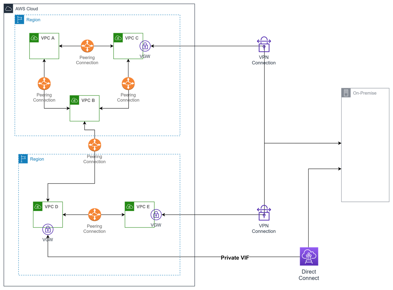 VPC Peering을 사용해 같은 리전에 있는 VPC와 다른 리전에 있는 VPC를 연결하고 VPN을 통해 온프레미스 네트워크와 연결하기위해서는 다음과 같은 구조로 인프라를 구성해야 됩니다.