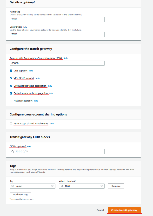 - Transit Gateway CIDR Block(선택 사항)