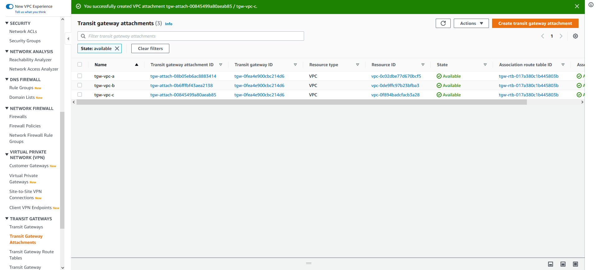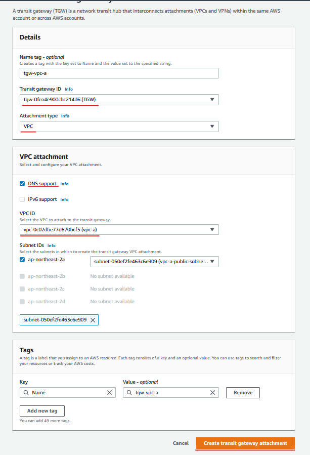 모든 설정을 마쳤다면 하단에 Create transit gateway attachment 버튼을 눌러 VPC를 추가해 줍니다.