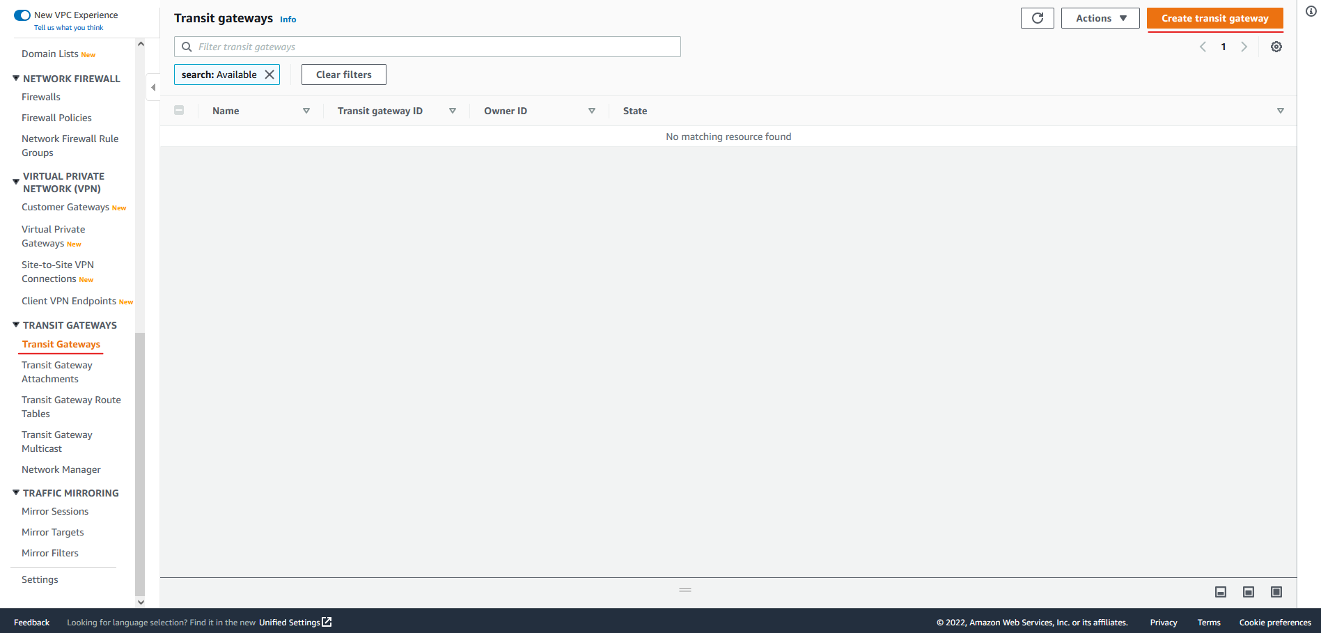 모든 설정을 마쳤다면 하단에 Create transit gateway 버튼을 눌러 Transit Gateway를 생성해 줍니다.