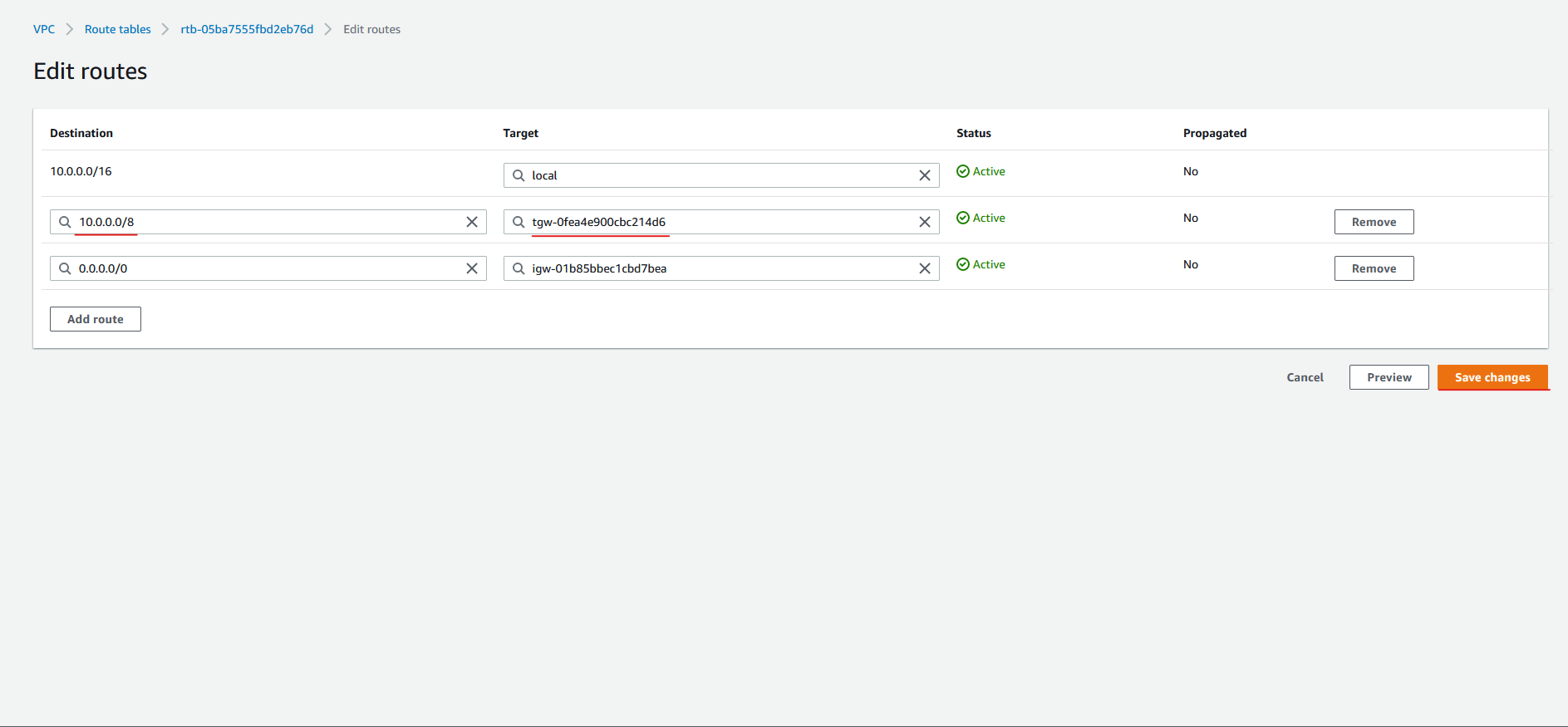 필자의 경우 3개의 VPC 모두 CIDR가 10.x.0.0/16 으로 시작하기 때문에 Destination을 10.0.0.0/8 로 지정해 주었습니다.