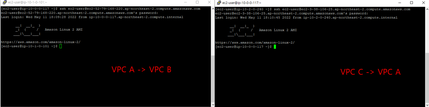 VPC A 에서 VPC B로, VPC C에서 VPC A로 ssh 접속을 시도해본 결과, 성공적으로 접속이 되는 것을 보실 수 있습니다.