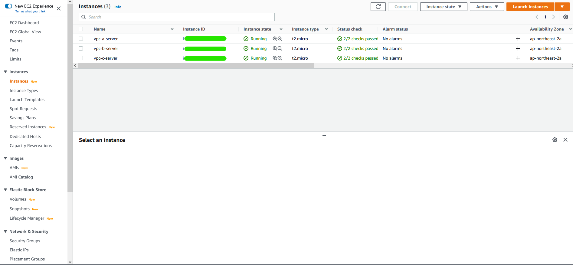 필자는 테스트를 위해 각 VPC 별로 인스턴스를 하나씩 생성해 주었습니다. (인스턴스 생성 과정은 생략하도록 하겠습니다.)