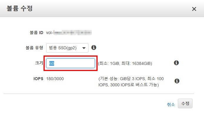 확장하고자 하는 볼륨을 선택 후 “볼륨수정”