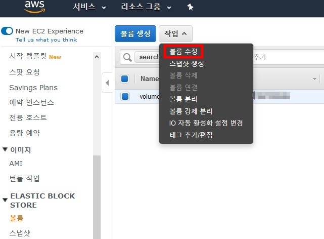 AWS 콘솔 -> EC2 -> EBS(ELASTIC BLOCK STORE) -> 볼륨