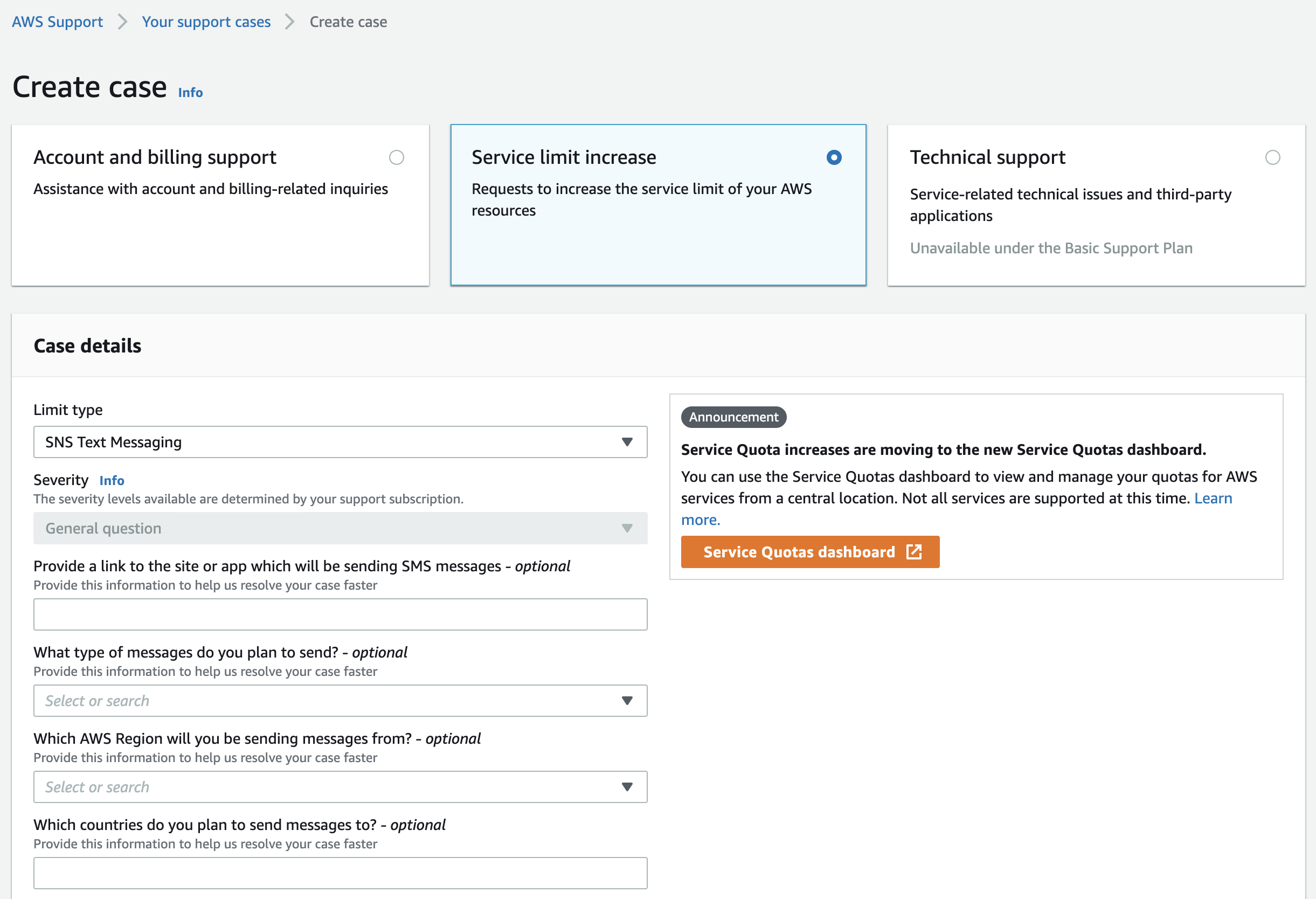 Service limit increase를 선택하고 아래 항목들을 작성을 하면 AWS 측에 문의를 할 수 있습니다.