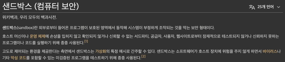 샌드박스란 외부로부터 들어온 프로그램이 보호된 영역에서 동작해 시스템이 부정하게 조작되는 걸 막는 보안 형태라고 설명합니다.