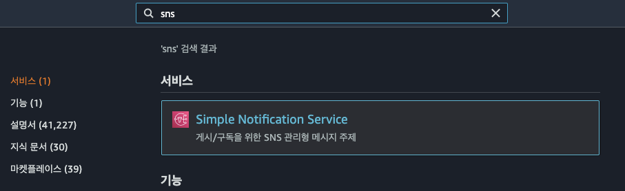 검색 창에 Simple Notification Service 또는 SNS라고 검색합니다.