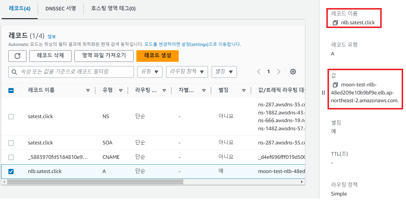 - Route53에 등록된 호스팅 영역에서 NLB를 A레코드 별칭으로 등록하자.