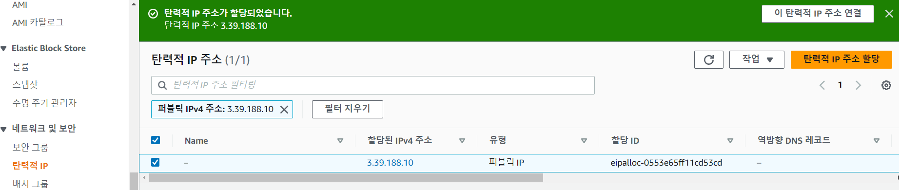 - NLB에 고정 IP를 할당해야하기 때문에 미리 EIP를 발급받아둔다.