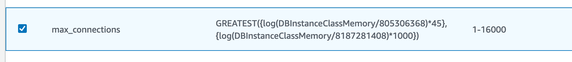 GREATEST({log(DBInstanceClassMemory/805306368)*45},{log(DBInstanceClassMemory/8187281408)*1000})