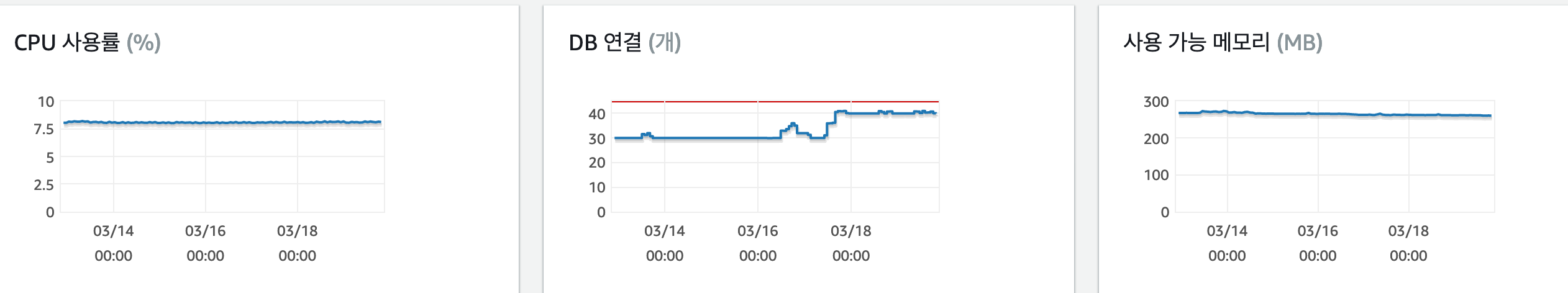 CPU 나 메모리 상으로는 큰 부하가 없는 상태이며 DB 연결은 45개에 근접한 상태이다.
