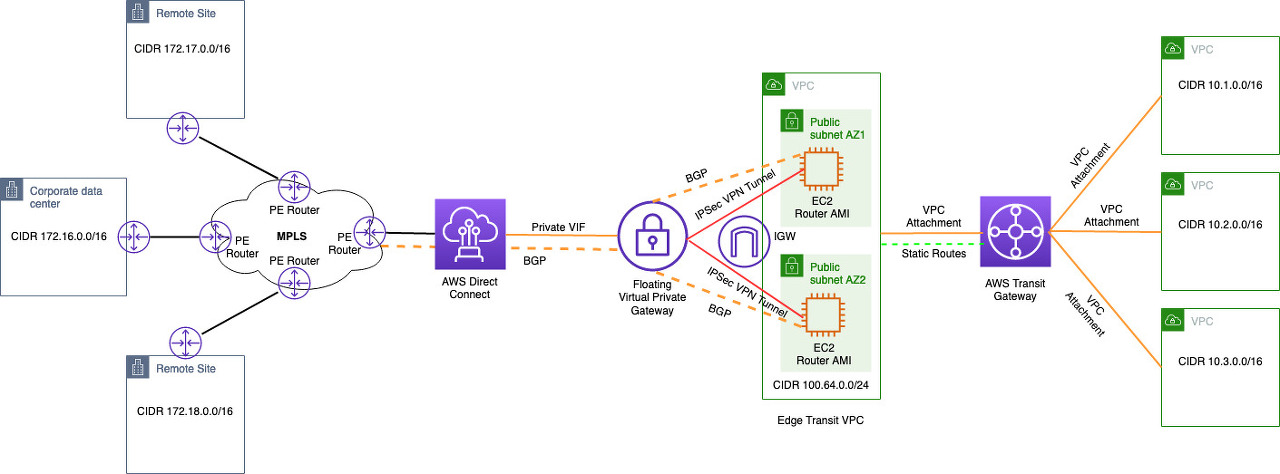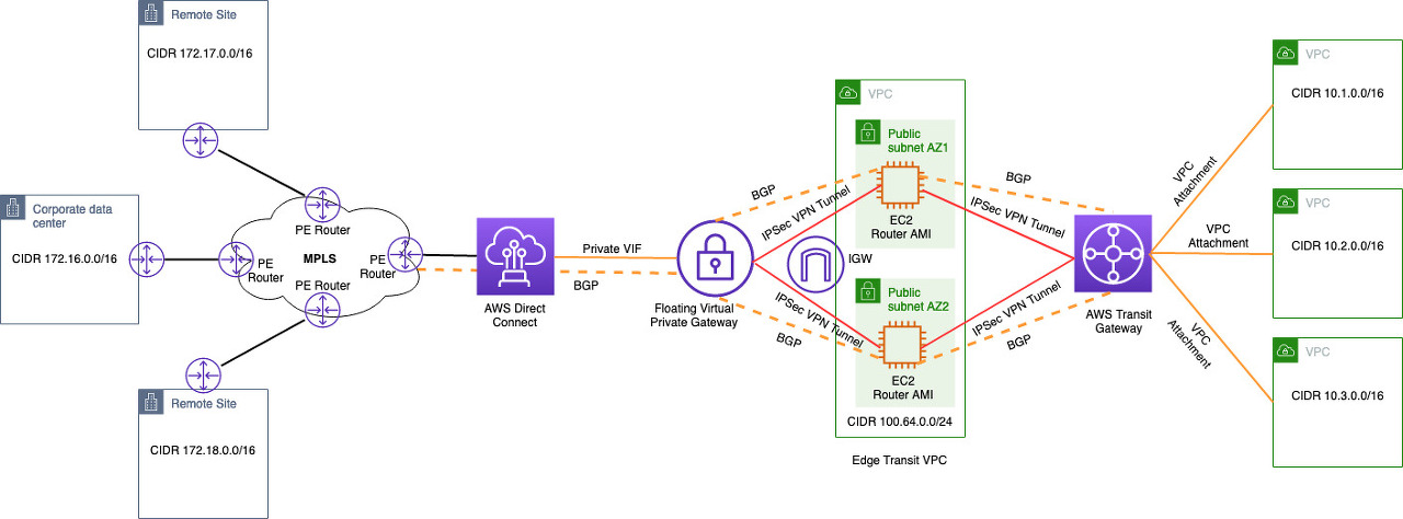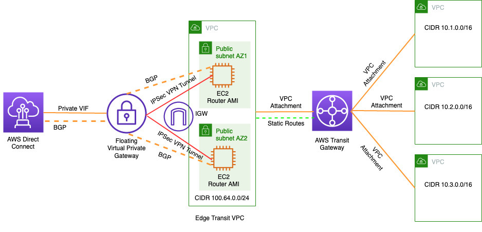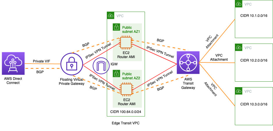 플로팅 가상 프라이빗 게이트웨이와 라우터 Amazon 머신 이미지(AMI)를 실행하는 EC2 인스턴스 사이.이러한 피어링은 에지 전송 VPC를 통해 AWS Transit Gateway에서 온프레미스로 수신된 접두사를 교환하고 그 반대의 경우도 마찬가지입니다.