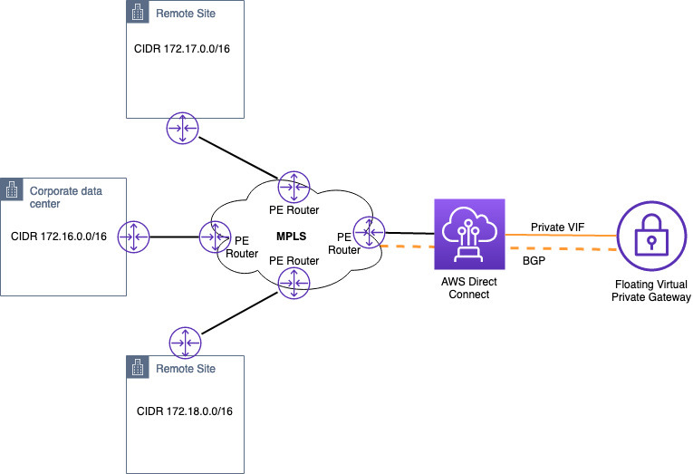 PE 라우터와 플로팅 가상 프라이빗 게이트웨이 사이.이러한 피어링은 온프레미스 접두사를 AWS로 교환하고 그 반대도 마찬가지입니다.