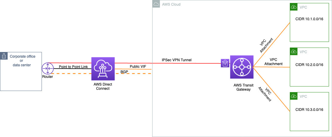 이 방법은 VPN을 AWS Transit Gateway에 연결하는 것과 유사합니다.이 경우 AWS Direct Connect를 통해 AWS Transit Gateway에 대한 VPN을 설정합니다.다음 다이어그램은 시나리오와 솔루션을 보여줍니다.