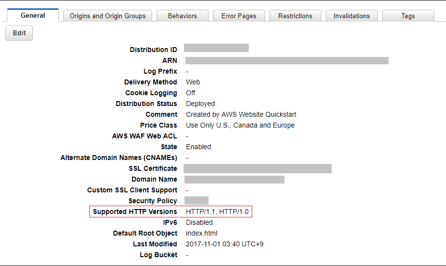 이제 상단의 Edit 버튼을 눌러 배포판의 설정을 변경하도록 하자. 밑으로 쭉 내리다보면 Supported HTTP Versions라는 항목이 있다.