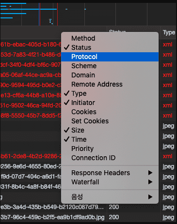 또는 크롬 브라우저의 개발자 도구 Network 탭에서 테이블 헤드에 마우스 우클릭을 하면 Protocol 컬럼을 활성화 시킬 수도 있다.
